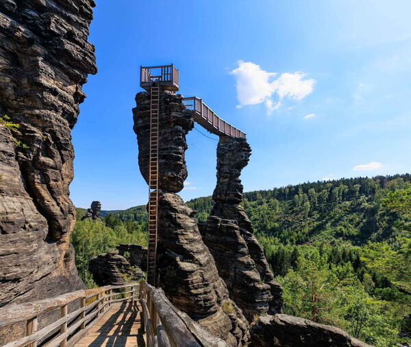 Der Blick vom Wahrzeichen der Gemeinde Rosenthal-Bielatal, den Herkulessäulen, ist heute nicht mehr nur mutigen und versierten Bergsteigern vorbehalten sondern steht ab sofort der Allgemeinheit - etwas Fitness und Schwindelfreiheit vorausgesetzt - offen. Auf der großen Herkulessäule wurde dabei sensibel im oberen Bereich nach dem großen Vorbild Basteiaussicht etwas ohnehin brüchiger Sandstein abgetragen und darauf die neue Aussichtsplattform errichtet. Von da können sich ganz Mutige über einen Skywalk auf die kleine Herkulessäule wagen.