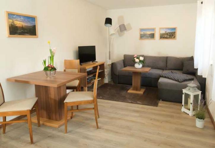 Schlafzimmer mit Doppelbett, Wohnzimmer mit 1 Aufbettung (Schlafsofa), Küche, DU+WC
