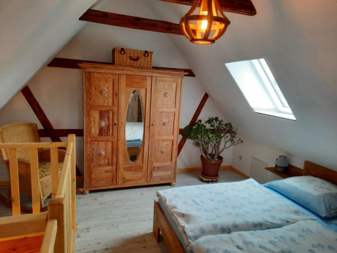 Die Ferienwohnung Felix ist durch einen separaten Eingang über eine Außentreppe erreichbar. Zur Wohnung gehört auch ein eingezäunter Gartenbereich mit eigener Terrasse, welche mit rustikalen Gartenmöbeln ausgestattet ist. Sie ist für maximal 7 Personen ausgelegt. Für jeweils 2 Personen ist Platz im Schlafzimmer und Kinderzimmer. Zusätzlich kann durch eine ausklappbare Couch im Wohnzimmer ein Schlafplatz für 2 Personen geschaffen werden. Sollte Bedarf für einen weiteren Schlafplatz bestehen, kann die Couch im Atelier von einer Person zum Schlafen genutzt werden. Auch diese Wohnung erhält durch die freigelegten Balken einen ganz besonderen Charme. Sie verfügt über WLAN, eine komplett ausgestattete offene Küche mit Abzugshaube, sowie einem Herd inkl. Ofen, einem Geschirrspüler, eine Kaffeemaschine, Toaster, allerlei Töpfe und Pfannen und vieles mehr. An die offene Küche schließt sich das Wohnzimmer an. Das Wohnzimmer ist ausgestattet mit einem Esstisch, einem Sofa zum Erholen und einem Fernseher. An das Wohnzimmer schließt das Badezimmer an. Über eine Treppe gelangt man auf das Atelier, von welchem das Schlafzimmer, Kinderzimmer und die Toilette zu erreichen sind. Zusätzlich laden eine Couch und Fernseher hier zum entspannen ein. Der private Parkplatz ist unmittelbar vor dem Haus. Die Wohnung kann am Anreisetag um 16 Uhr bezogen werden und ist am Abreisetag bis 10 Uhr zu verlassen. Für unsere Urlauber, die mit einem E-Auto anreisen, bieten wir die Nutzung einer Wallbox an.